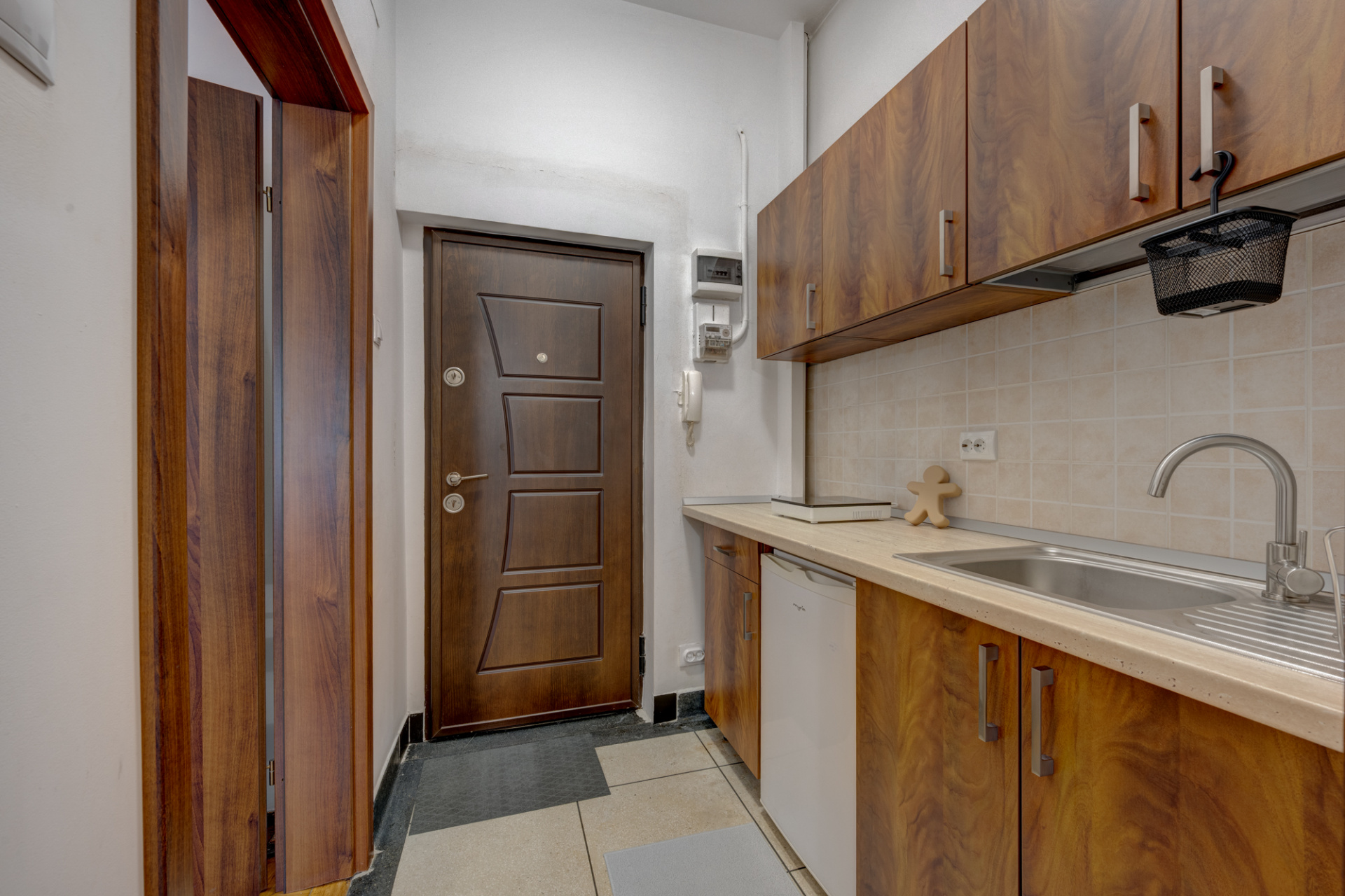 Garsoniera are o suprafata de 29 mp si o compartimentare decomandata, distribuita astfel: la intrare este un spatiu in suprafata de 4,61 mp in care s a amenajat o bucatarie, camera in suprafata de 20,66 mp si o baie in suprafata de 3,77 mp. Baia beneficiaza de fereastra cu lumina naturala si este amenajata cu cabina de dus, obiecte sanitare si masina de spalat rufe. Spatiul pentru bucatarie nu este foarte mare, este mobilat si dotat cu chiuveta, un mini frigider si 1 plita electrica ( IKEA). Este spatiu pe blat pentru un cuptor cu microunde/ Airfryer/espressor.
