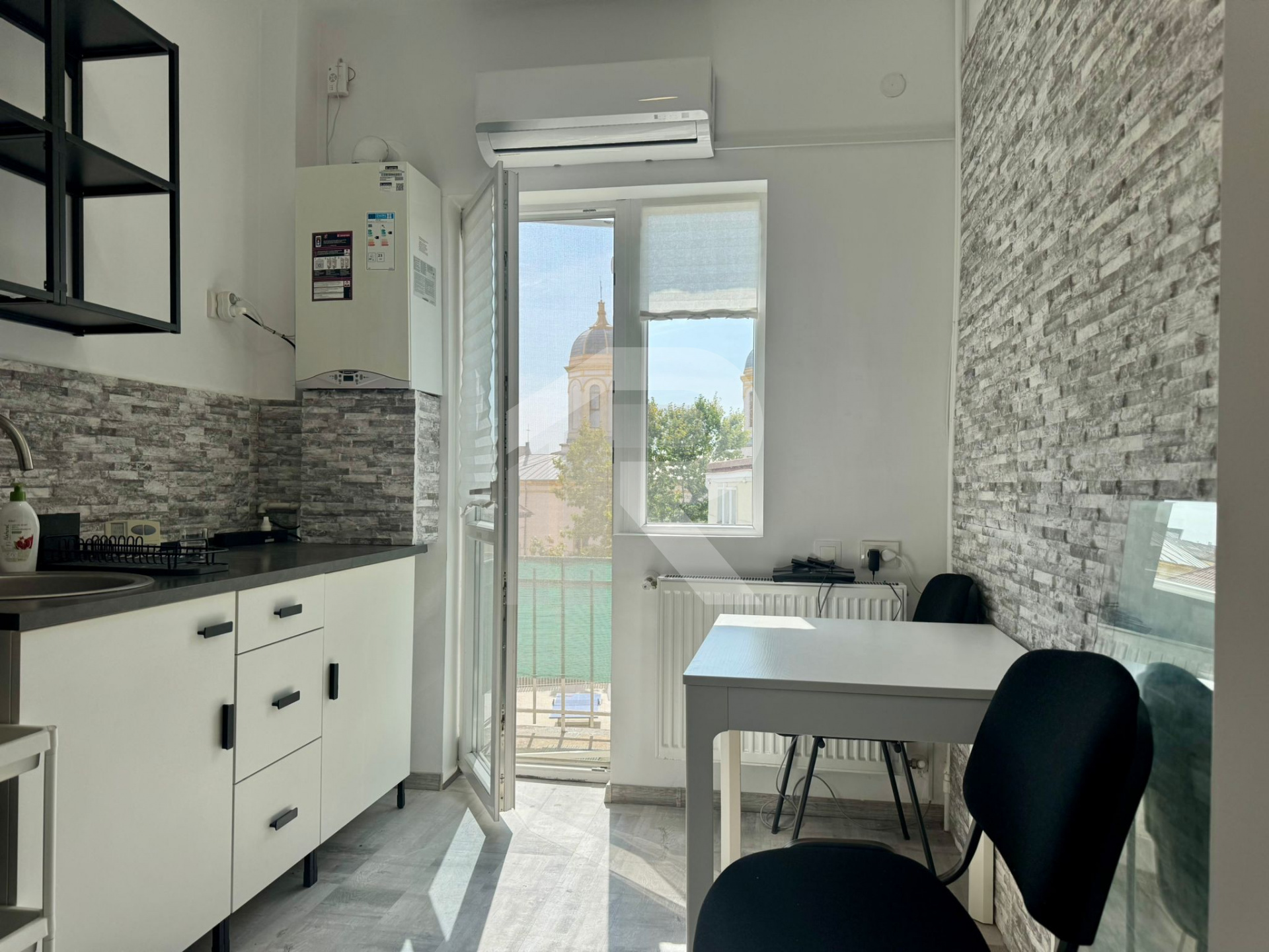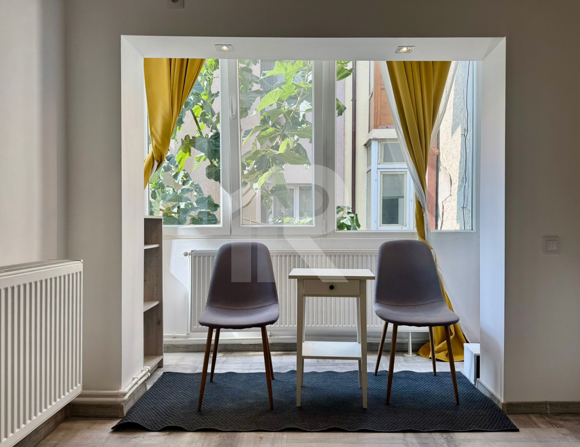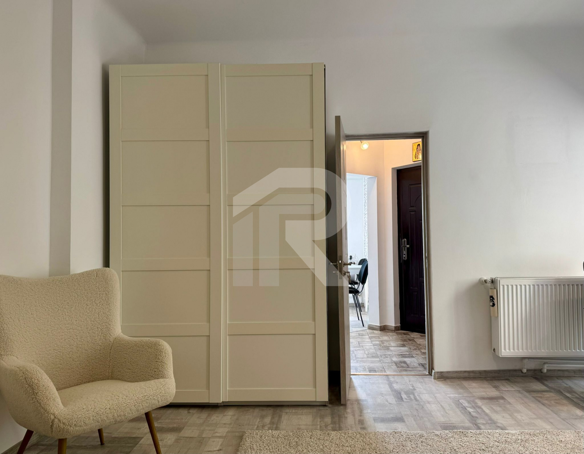 Garsonieră de 35 mp utili, situată la etajul 2/3, prima închiriere, decomandată, cu centrală proprie și acces printr-o scară de serviciu separată, folosită exclusiv. Persoanele de la parter și etajul 1 au intrare separată și nu trec pe scara dvs.; în plus, la etajul 1 momentan nu locuiește nimeni, iar la parter funcționează doar o firmă.
