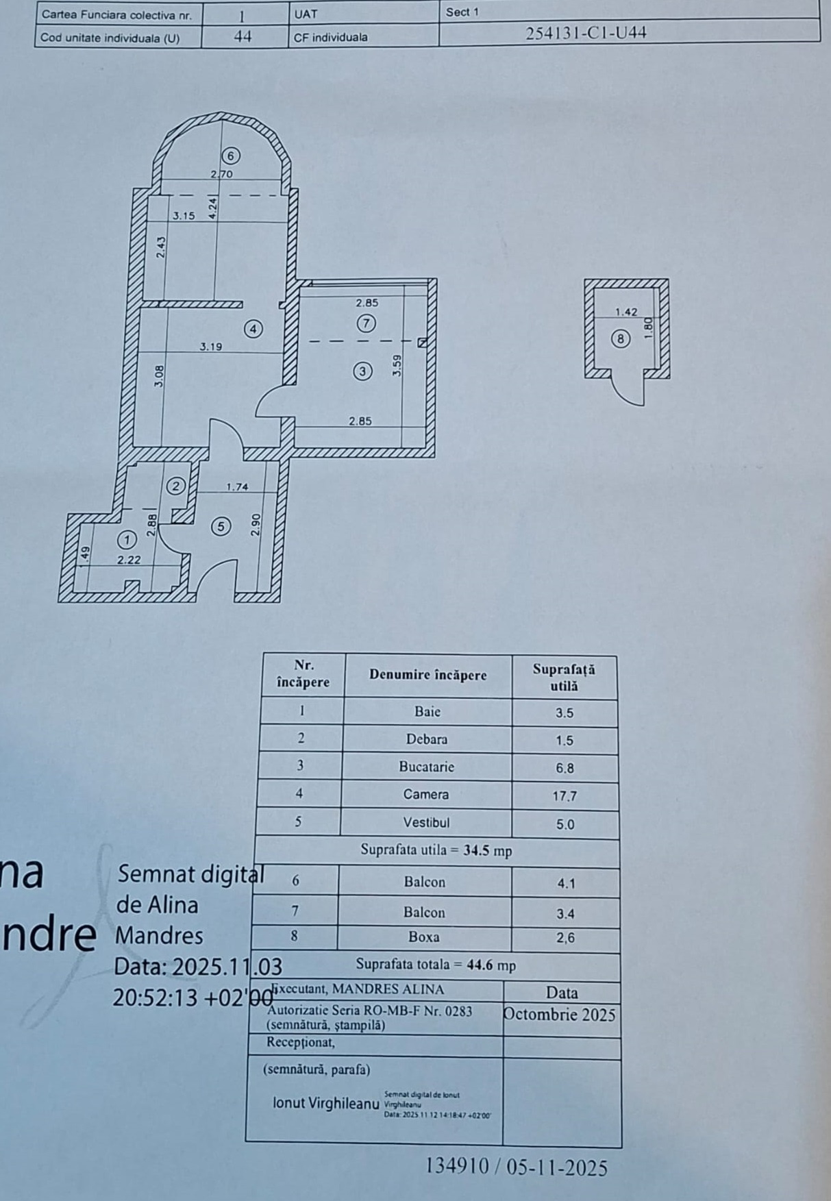 Suprafață utilă: 45 mp utili, Compartimentare: 1 cameră în acte, amenajat/compartimentat ca 2 camere (zonă de zi + zonă de noapte);