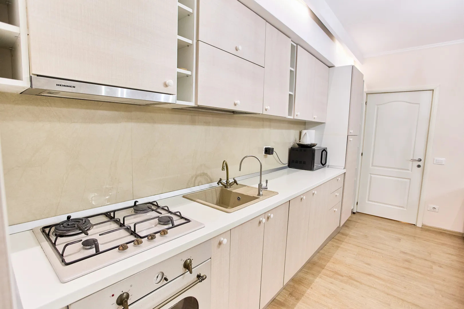 Living open-space cu bucătărie complet echipată, dormitor spațios, baie cu geam și balcon multifuncțional.