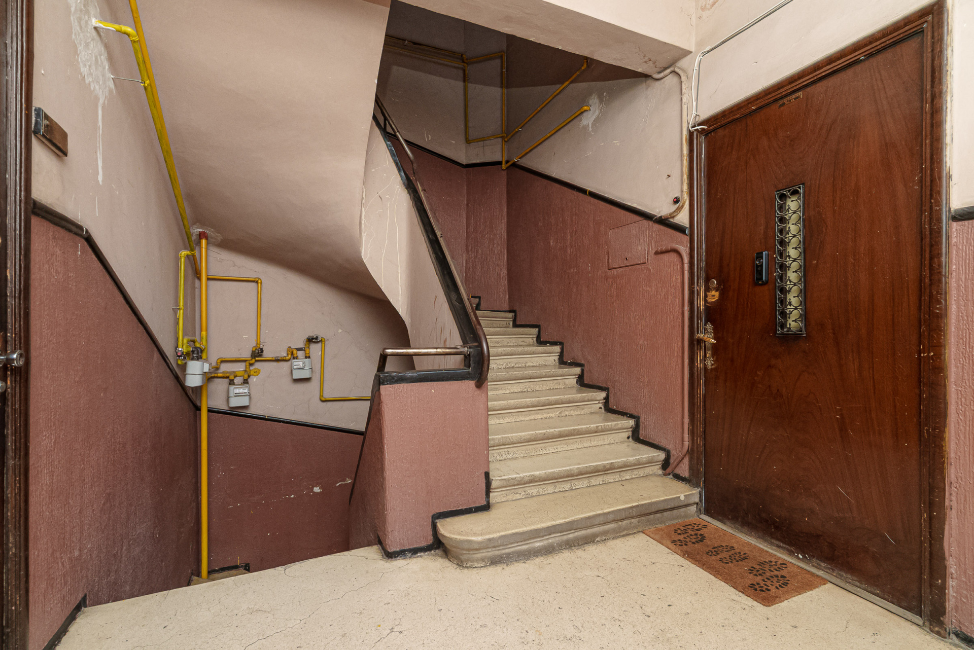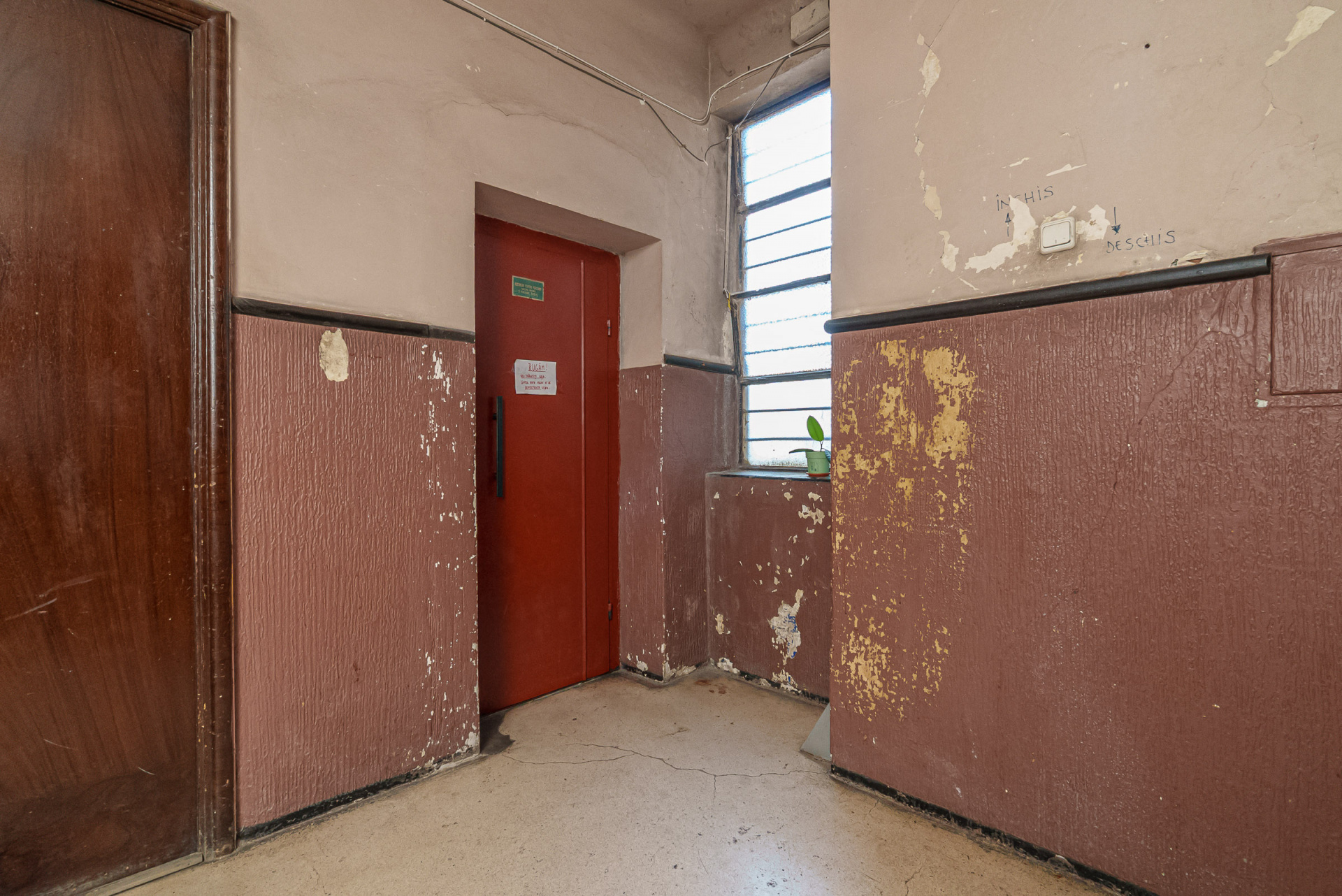 Apartamentul are geam la baie – un detaliu rar în clădirile vechi – și păstrează elemente autentice precum parchetul original și ușile masive, ce pot fi restaurate sau integrate într-un design eclectic.