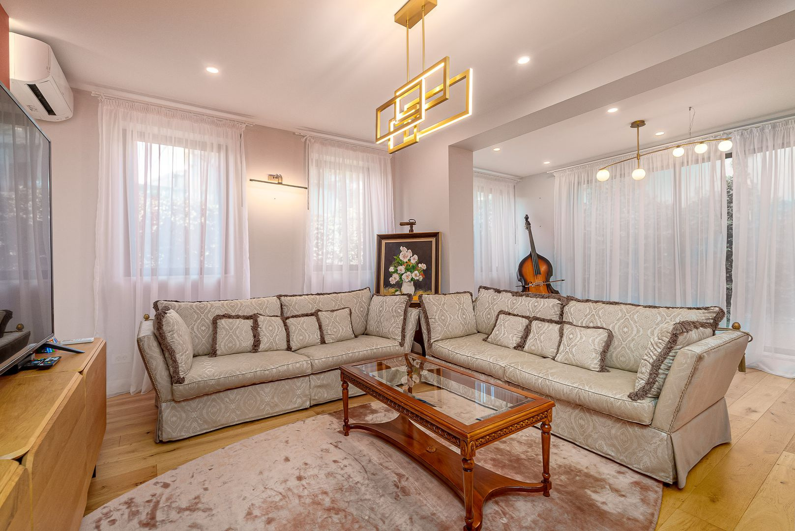 Apartamentul spatios de 90mp amenajat de o echipa de design interior beneficiaza si de o curte proprie de 77mp fiind localizat la parter . Dispune de un living spatios de 30 mp, doua dormitoare din care unul este transformat in dressing, doua bai mari de aprox 5 mp, una cu dus si una cu cada si o bucatarie plus camara de aprox 12mp. Accesul in curtea prorprie se face din cele 3 incaperi si din bucatarie. Toate materialele folosite sunt high end cu finisaje si dotari premium dupa cum urmeaza: