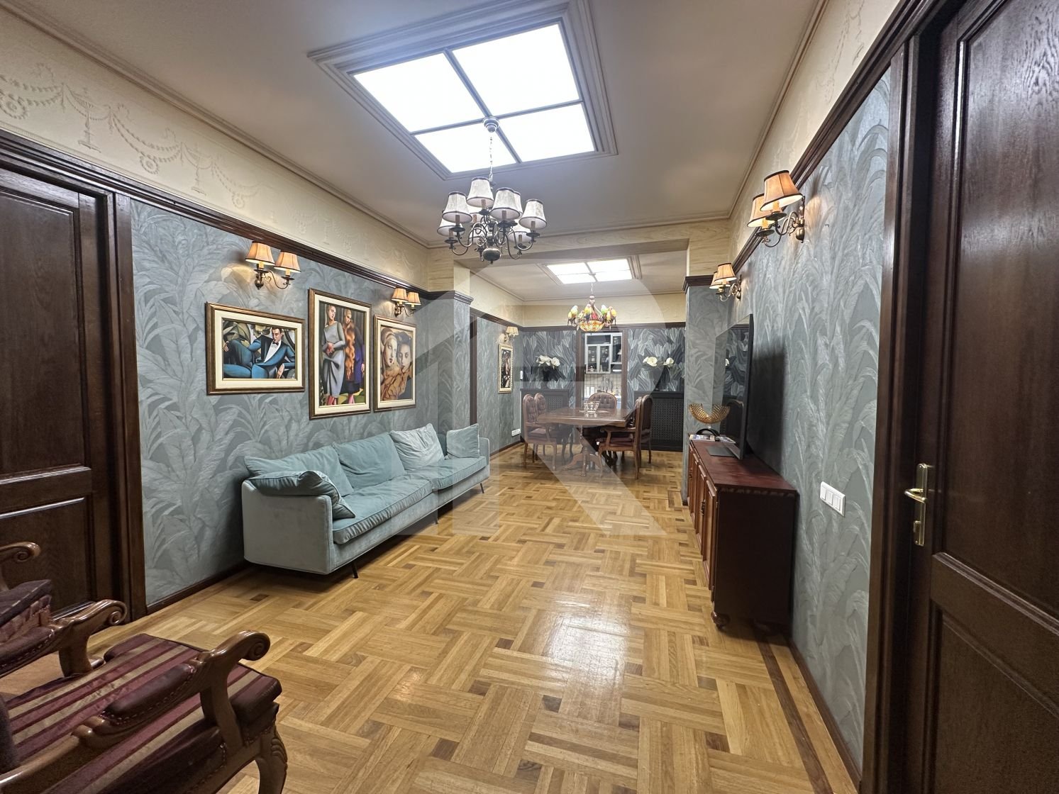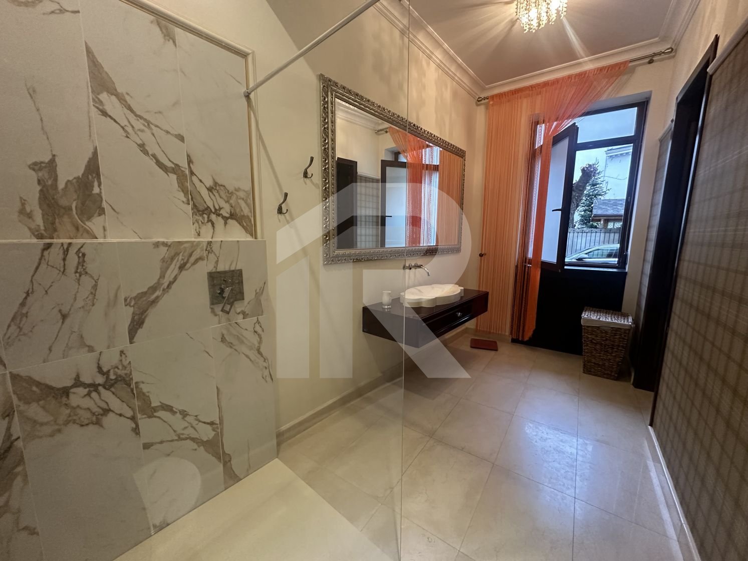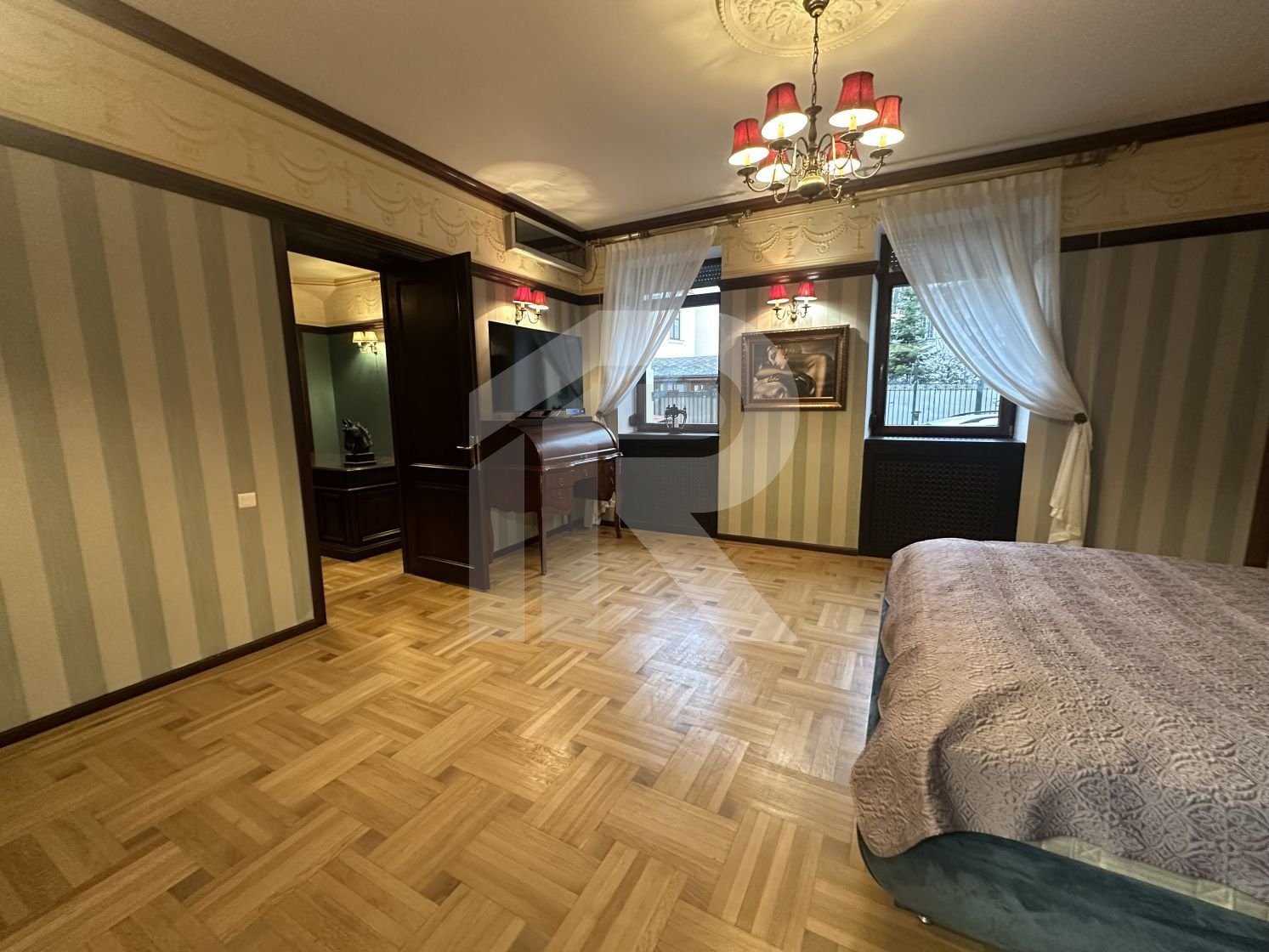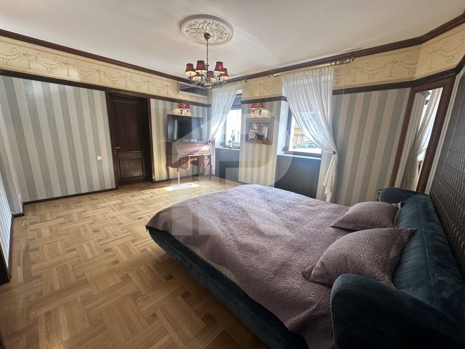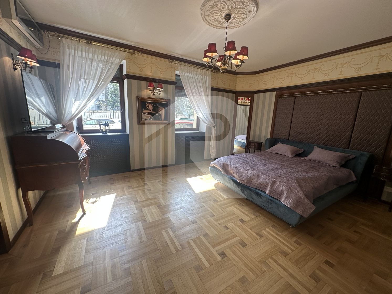 Apartamentul cu suprafata de 190 mp, tavanului inalt de 3 m, are 6 camere, 2 camere tip dressing, bucataria cu camara si centrala termica, 3 bai cu fereastra, iar balconul transformat intr-o camera-seif.