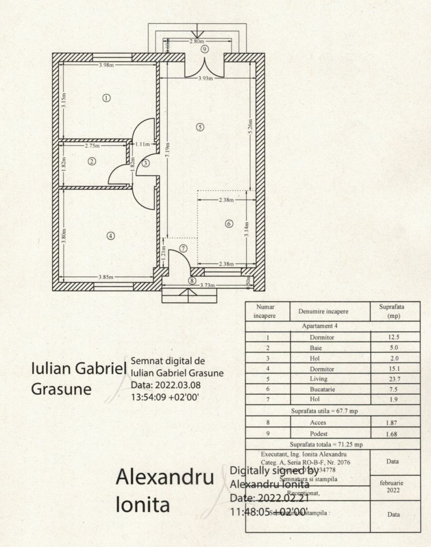 Casa cu 3 camere, cu amprenta de 79,05 mp, este total mobilată și utilată, echipată cu centrală termică proprie și aparate de aer condiționat.