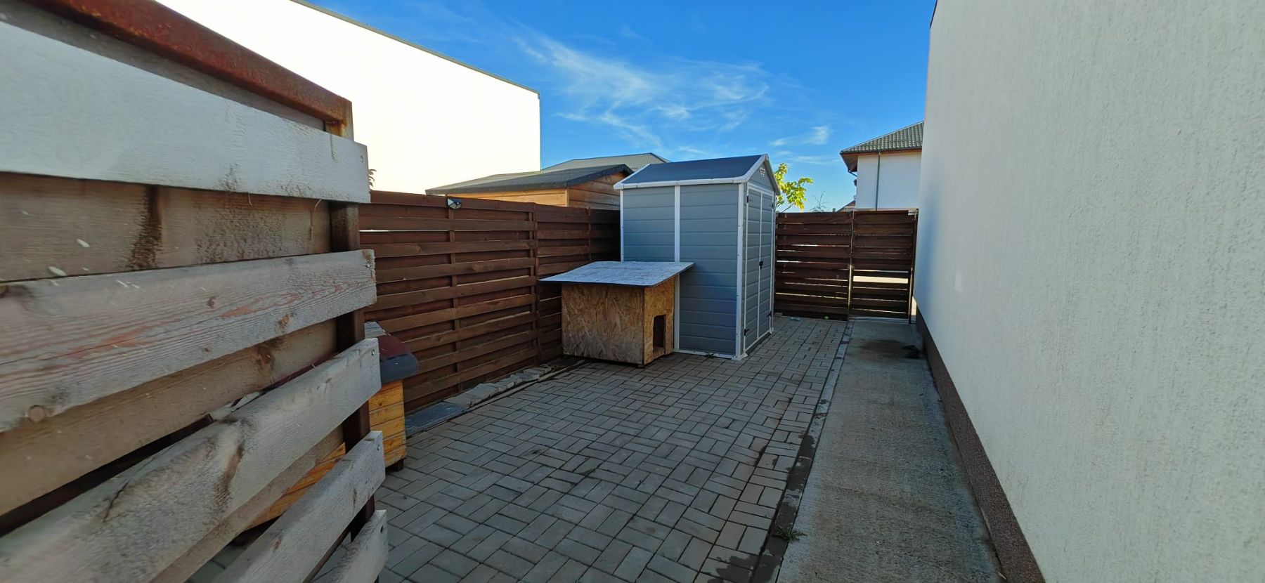 Are parcare pentru 3 masini. In curtea din spatele casei este spatiu pentru gratar, perfect pentru a ne petrece timpul liber cu familia si prietenii. In curtea laterala este o magazie pentru depozitare, are masina electrica de tuns gazon si aparat de spalat cu apa rece sub presiune Karcher.