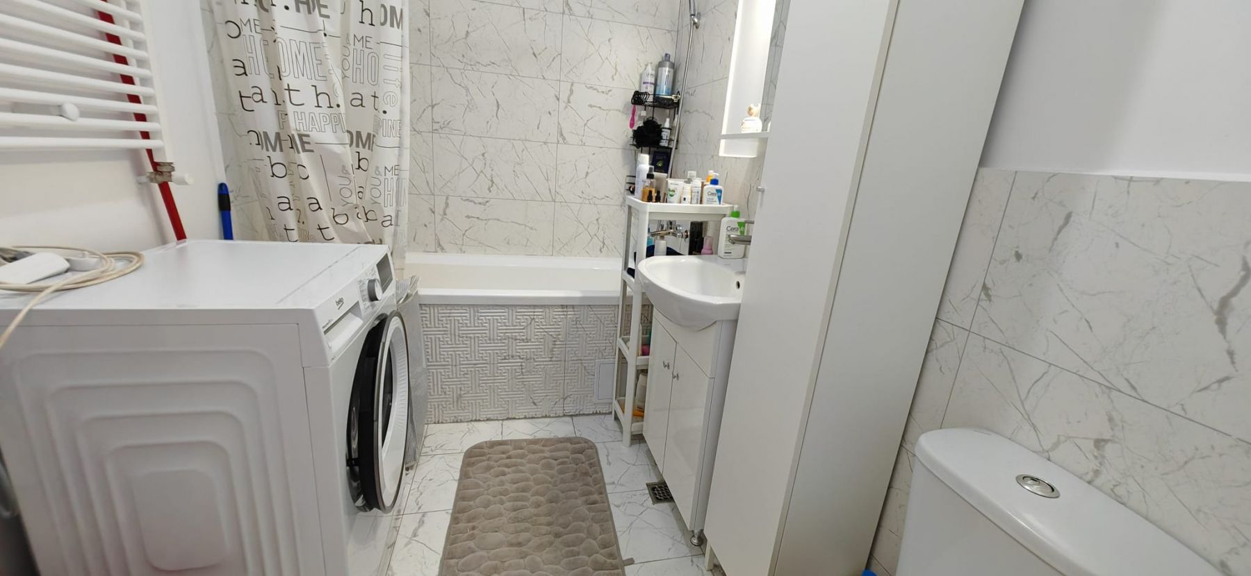 Baie este spațioasă, are cadă, mașină de spalat haine și uscator.