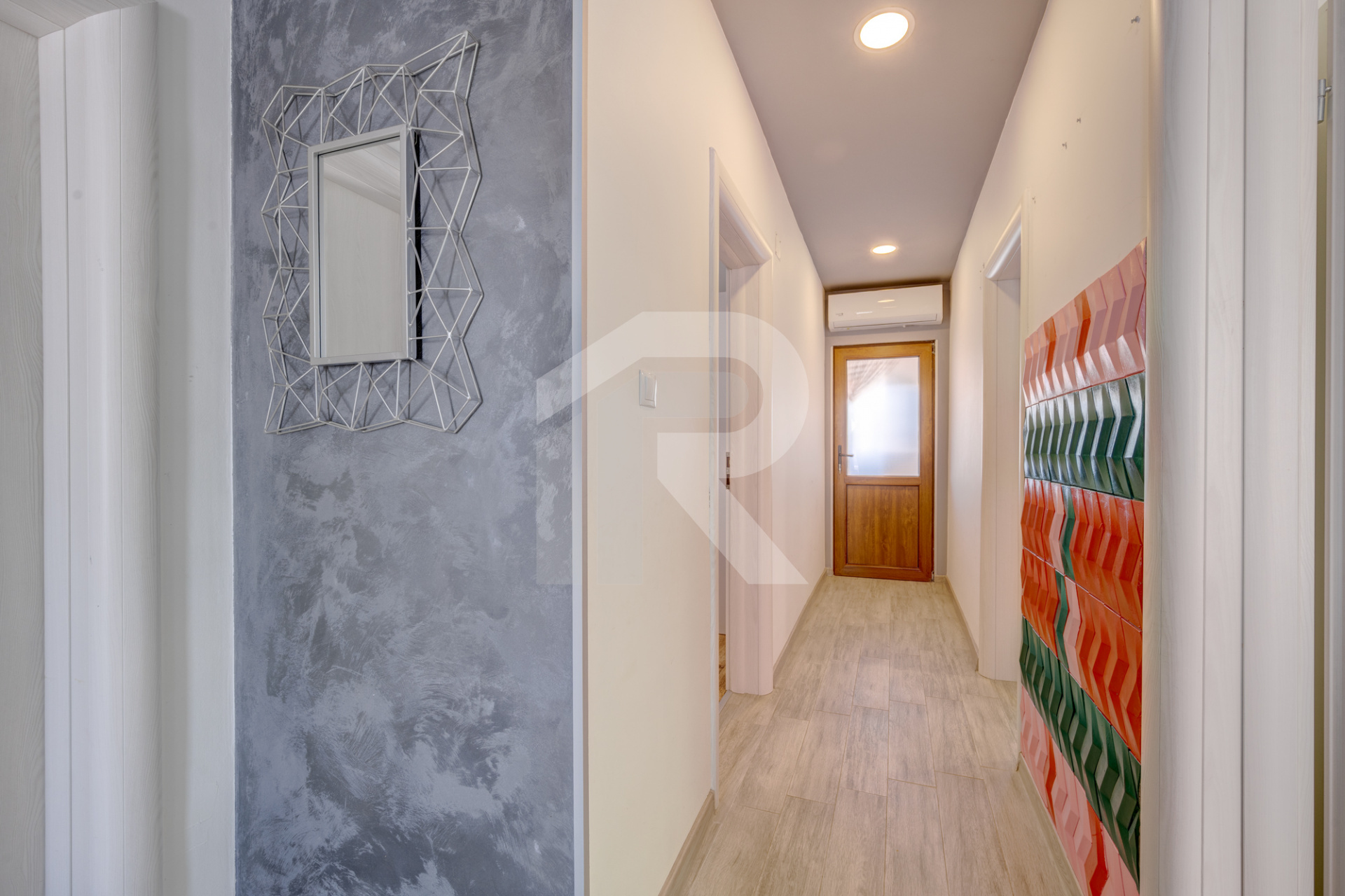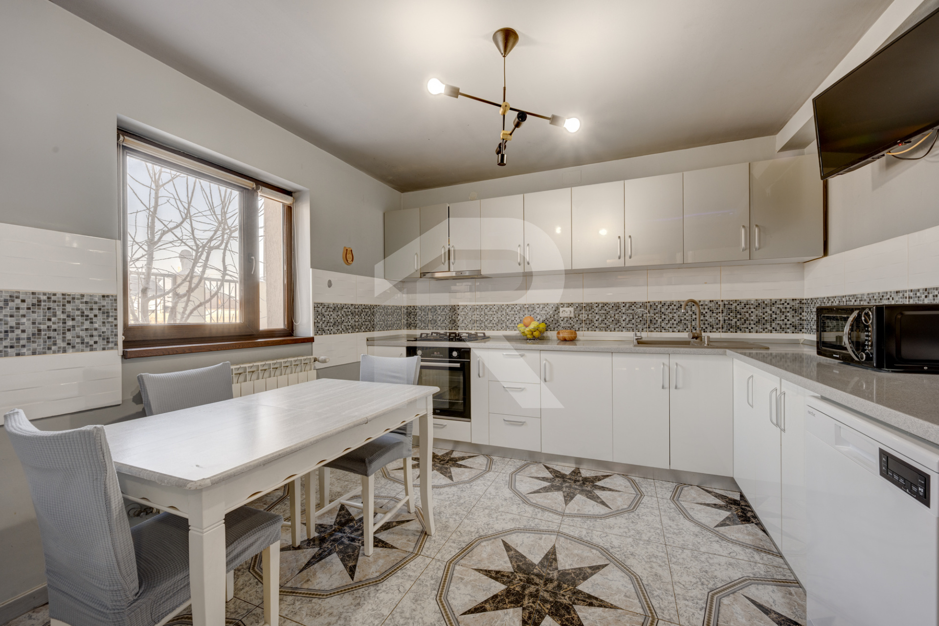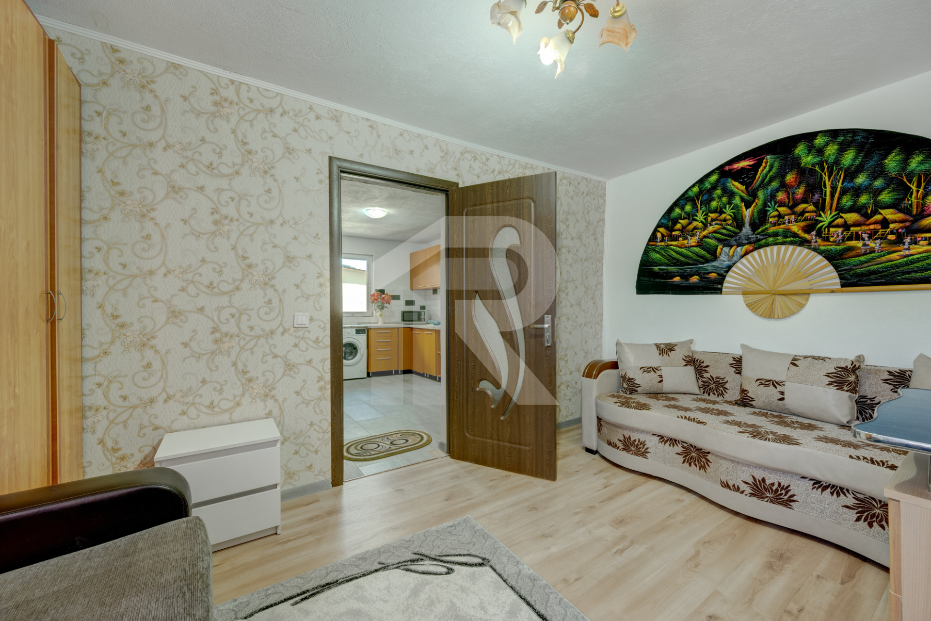 Interior luminos, bucatarie inchisa, living mare, spatii de depozitare.