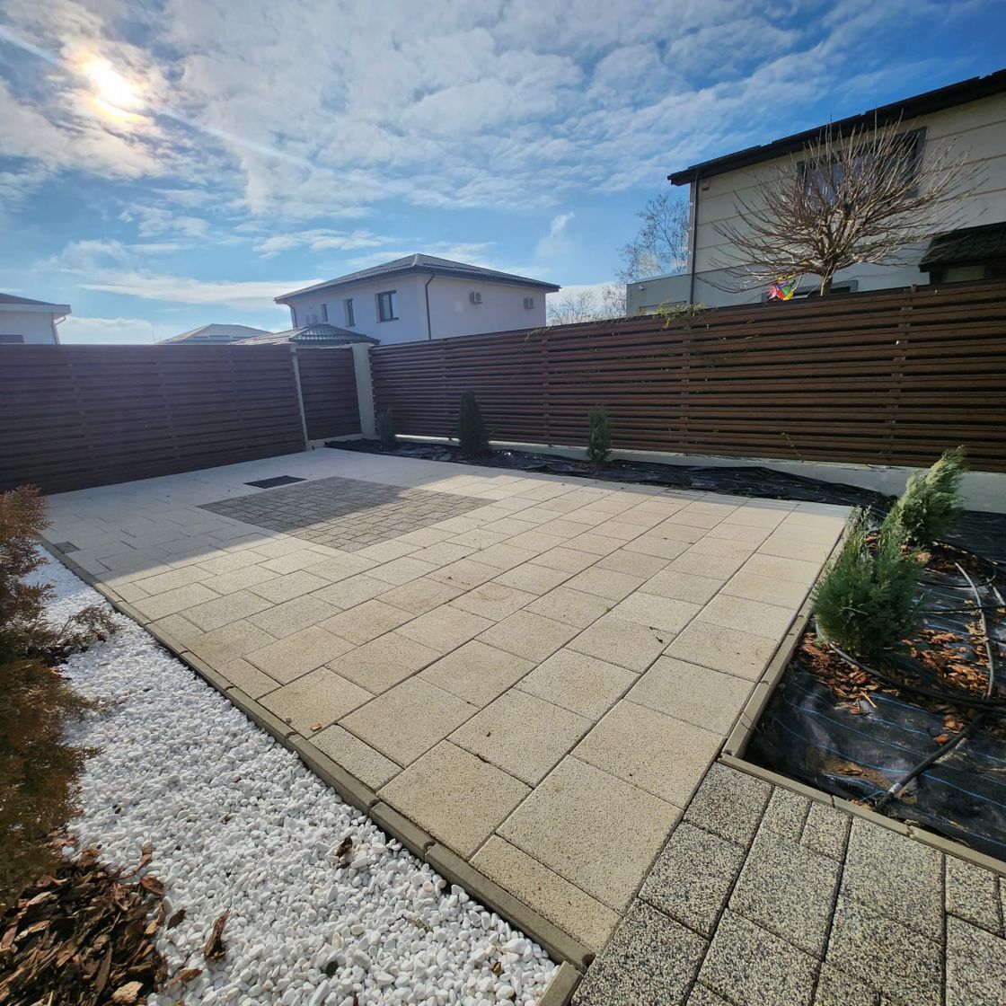 Teren 500 mp amenajat cu gazon, pavele pentru parcare si poarta electrica, plante si piatra decorativa.