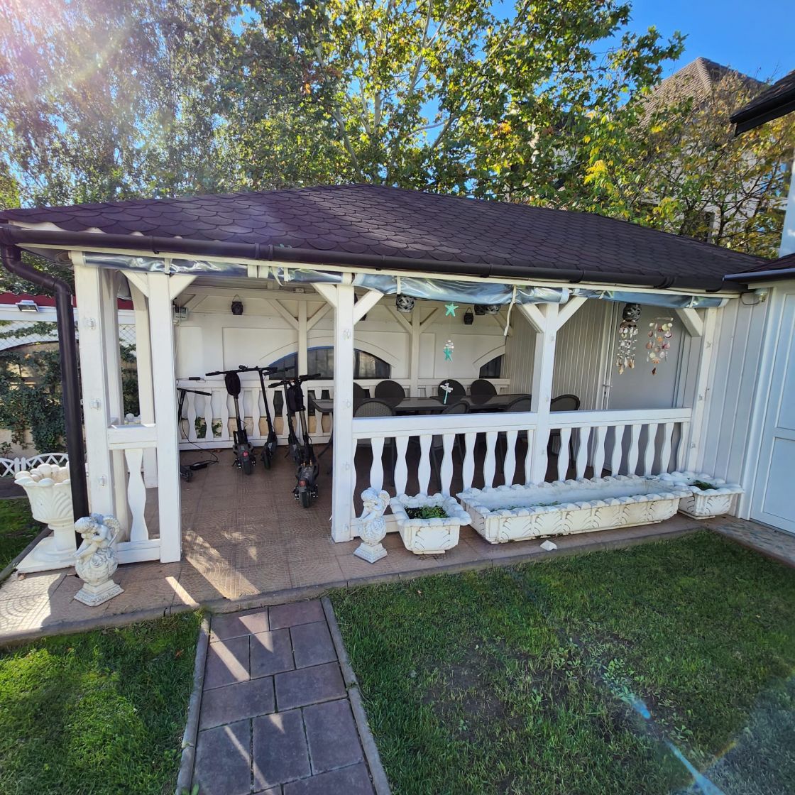 Curte amenajata cu bun gust, dotata cu doua foisoare unul de vara cu acoperis din sticla si unul toamna-iarna cu grup sanitar si spatiu inchis pentru depozitare, fantana arteziana si spatiu de joaca pentru copii