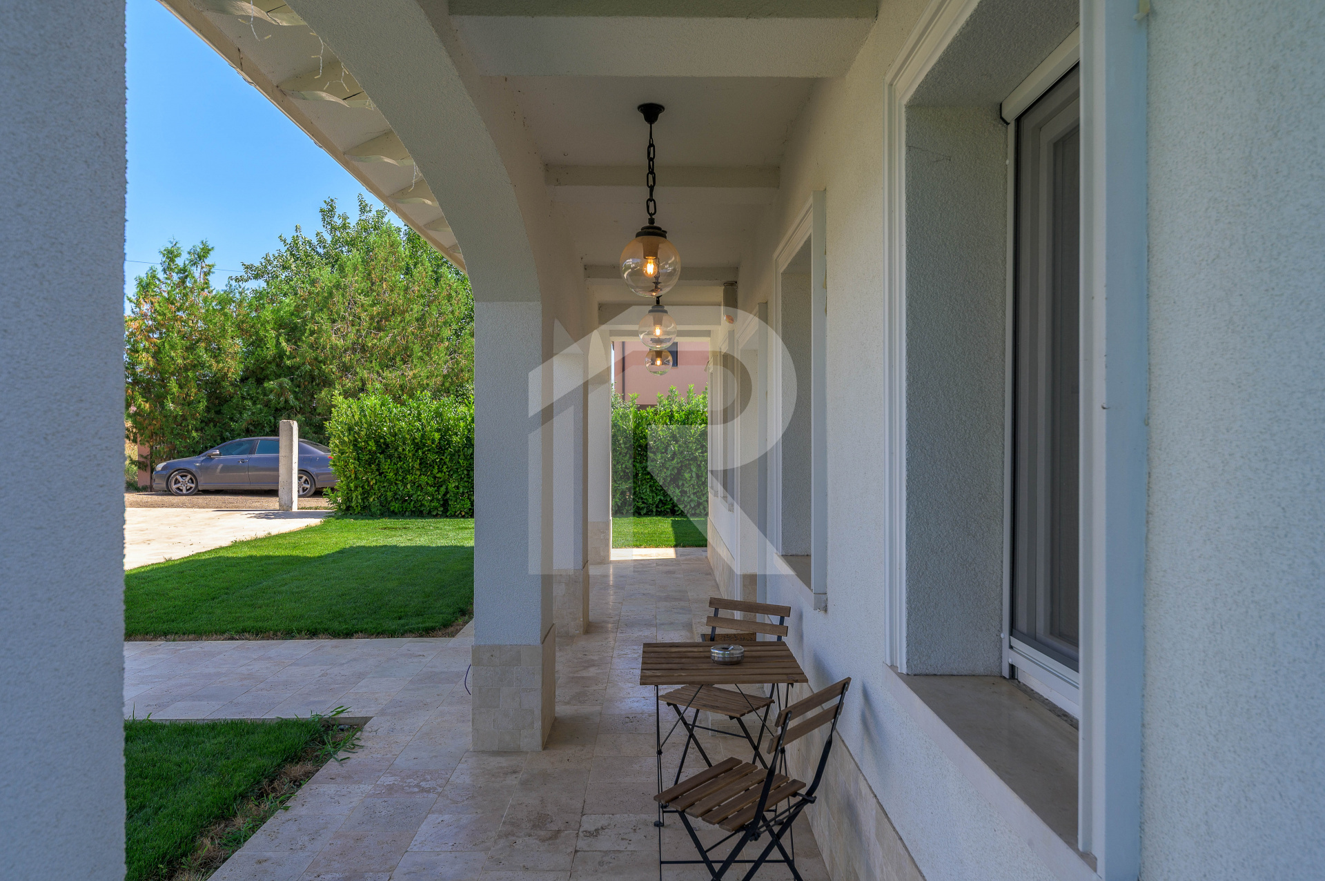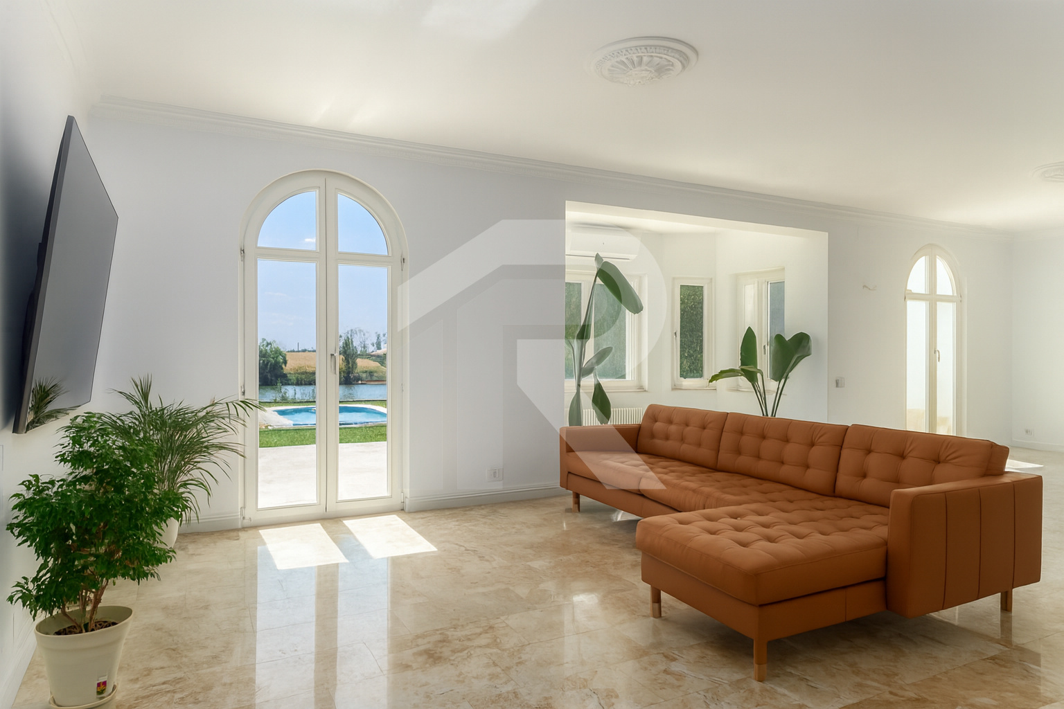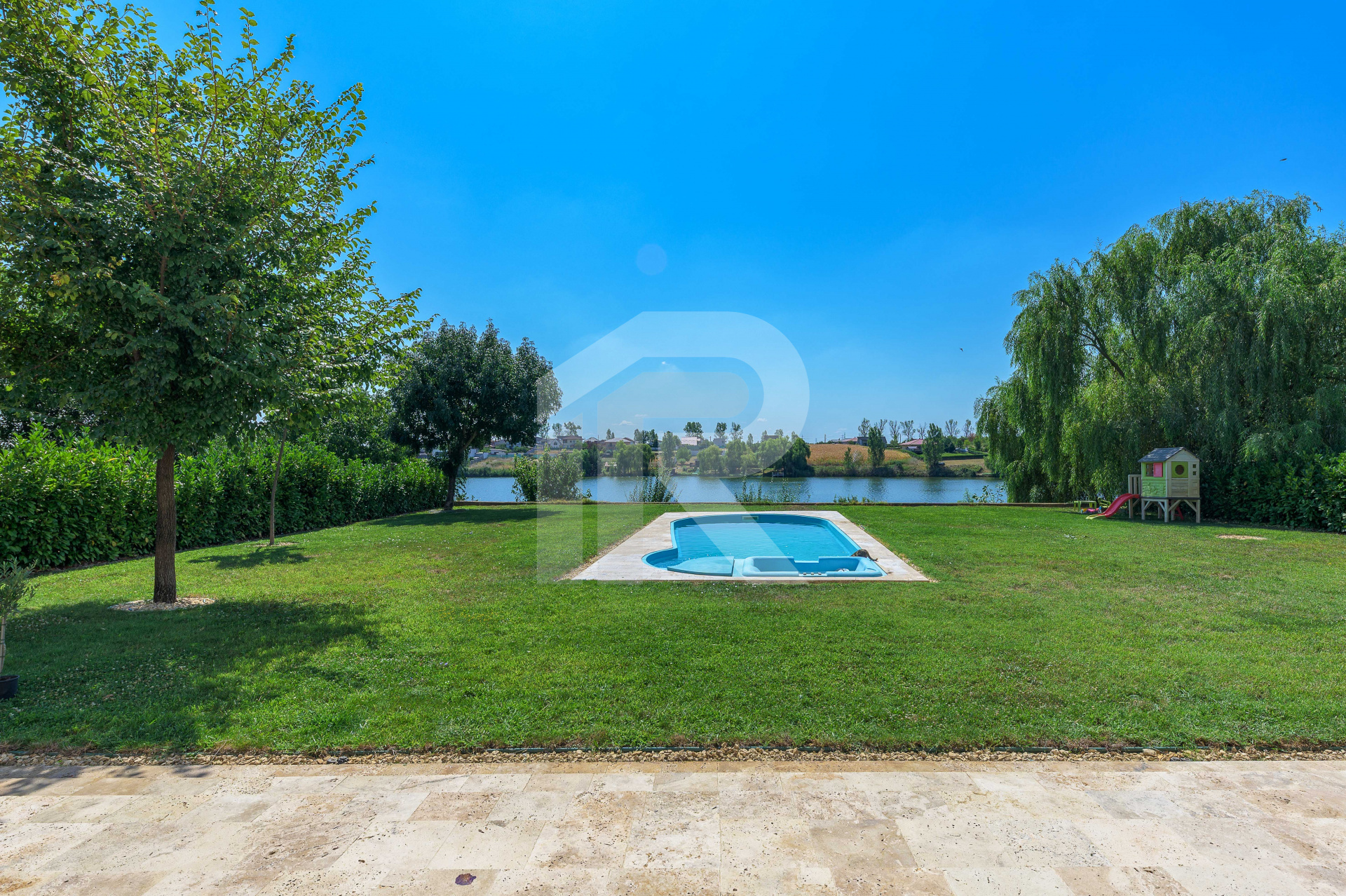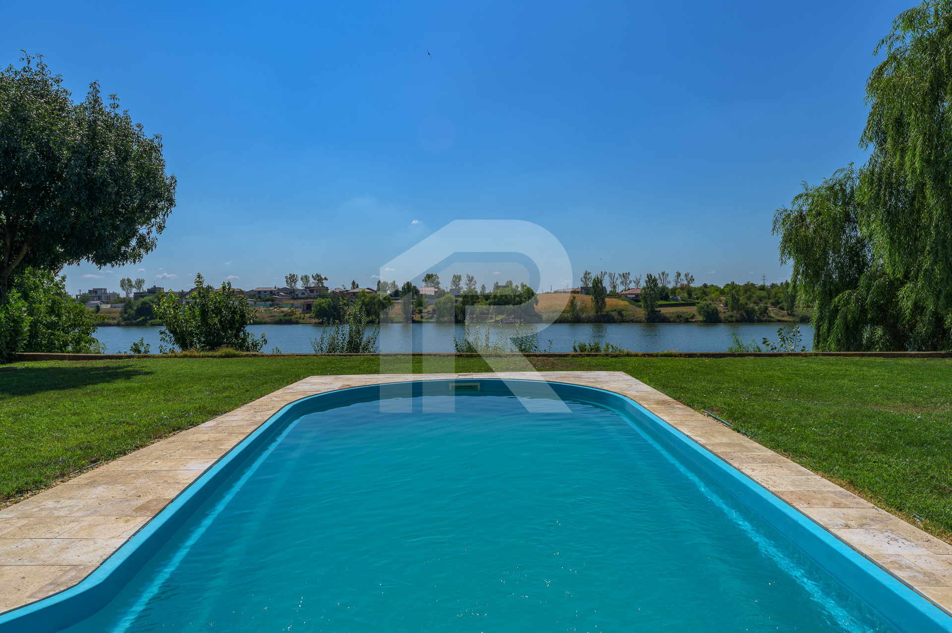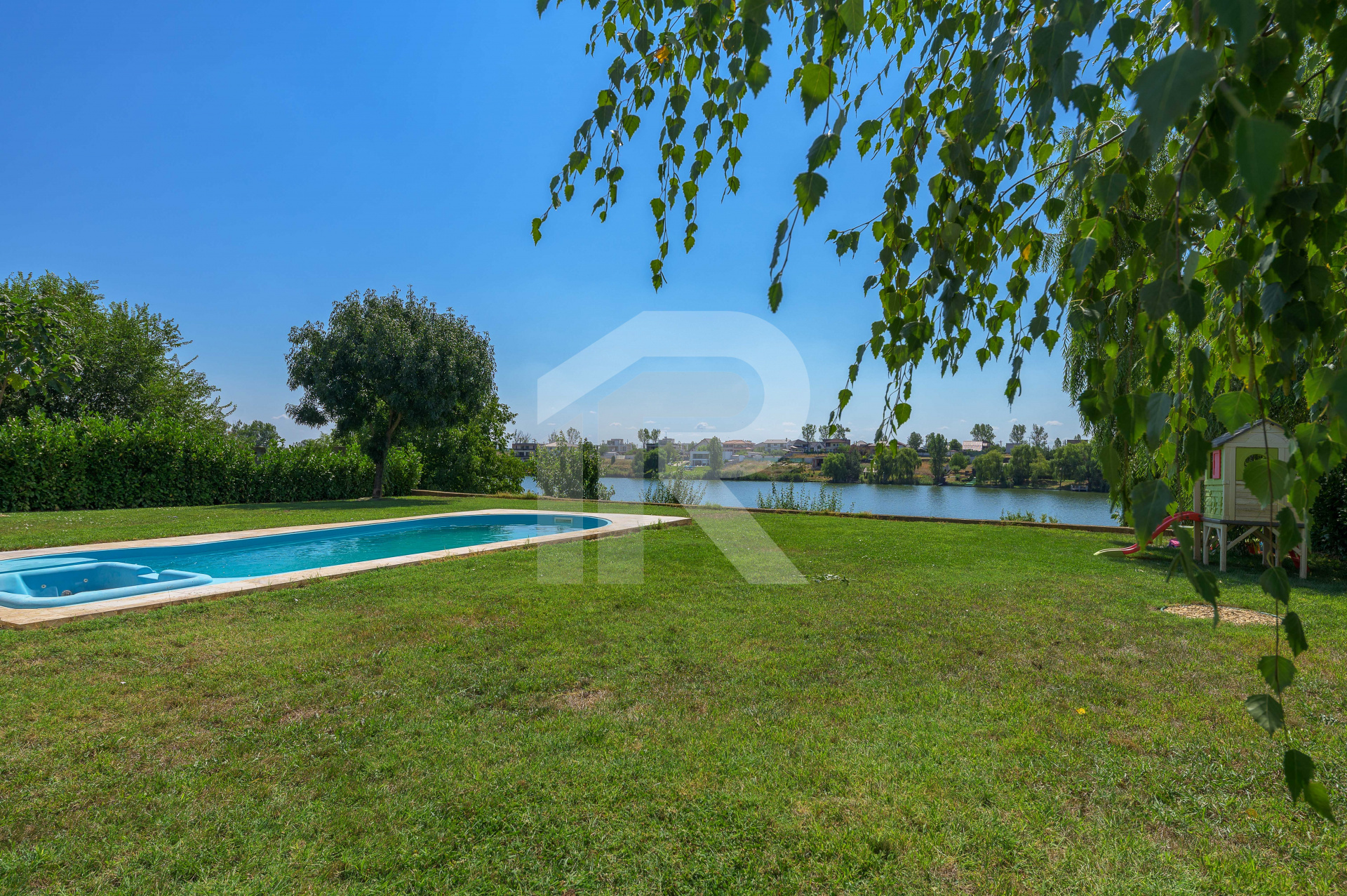 Pe partea de sud a terenului, din zona de zi și din bucătărie, se deschide o terasă superbă, care conduce firesc către curtea din spate, piscina generoasă și, în cele din urmă, spre Lacul Căciulați, situat chiar la marginea proprietății.