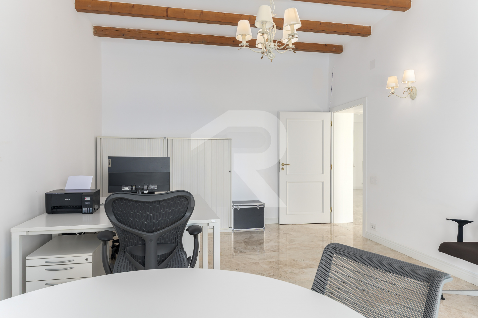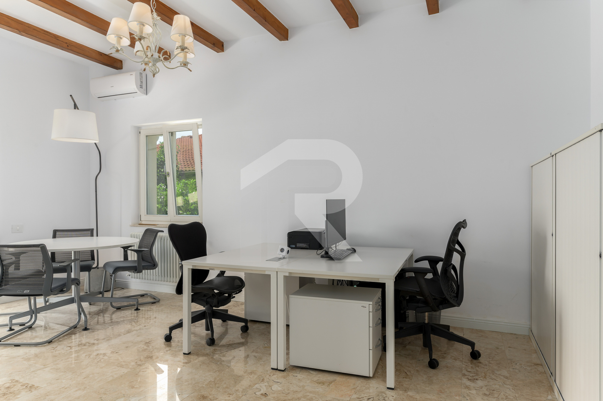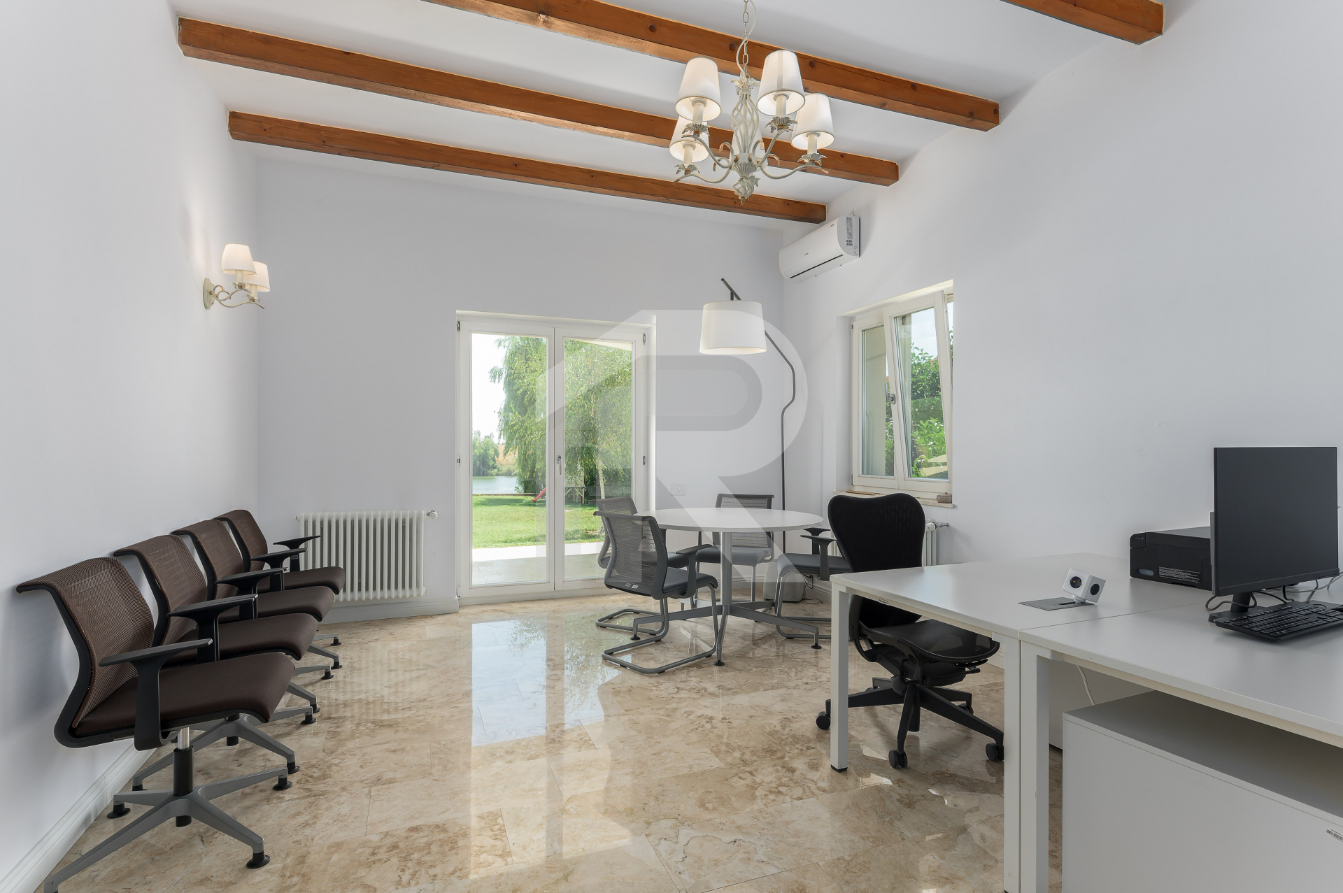 Birou spațios, luminos, cu acces fluid către curte și piscină.