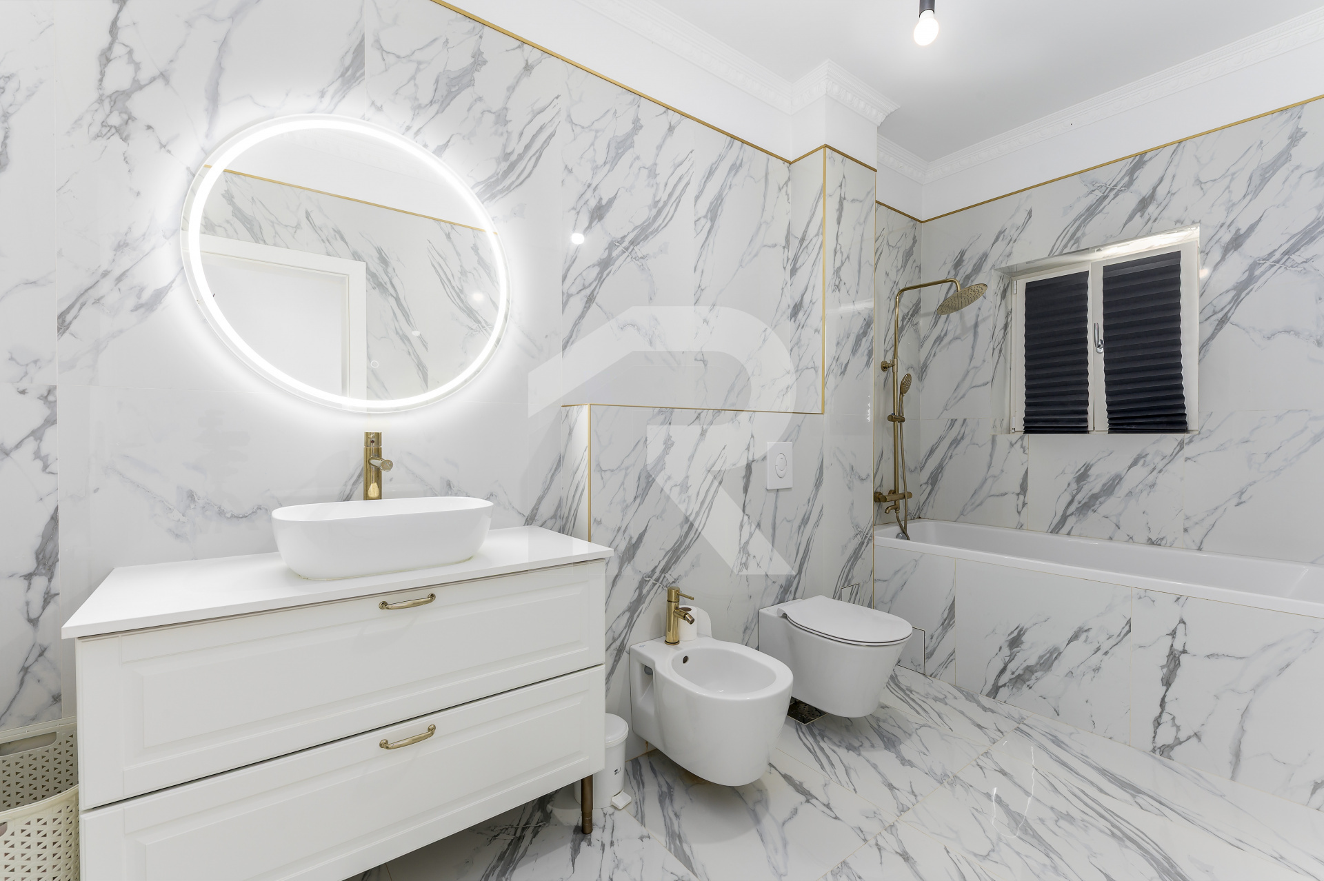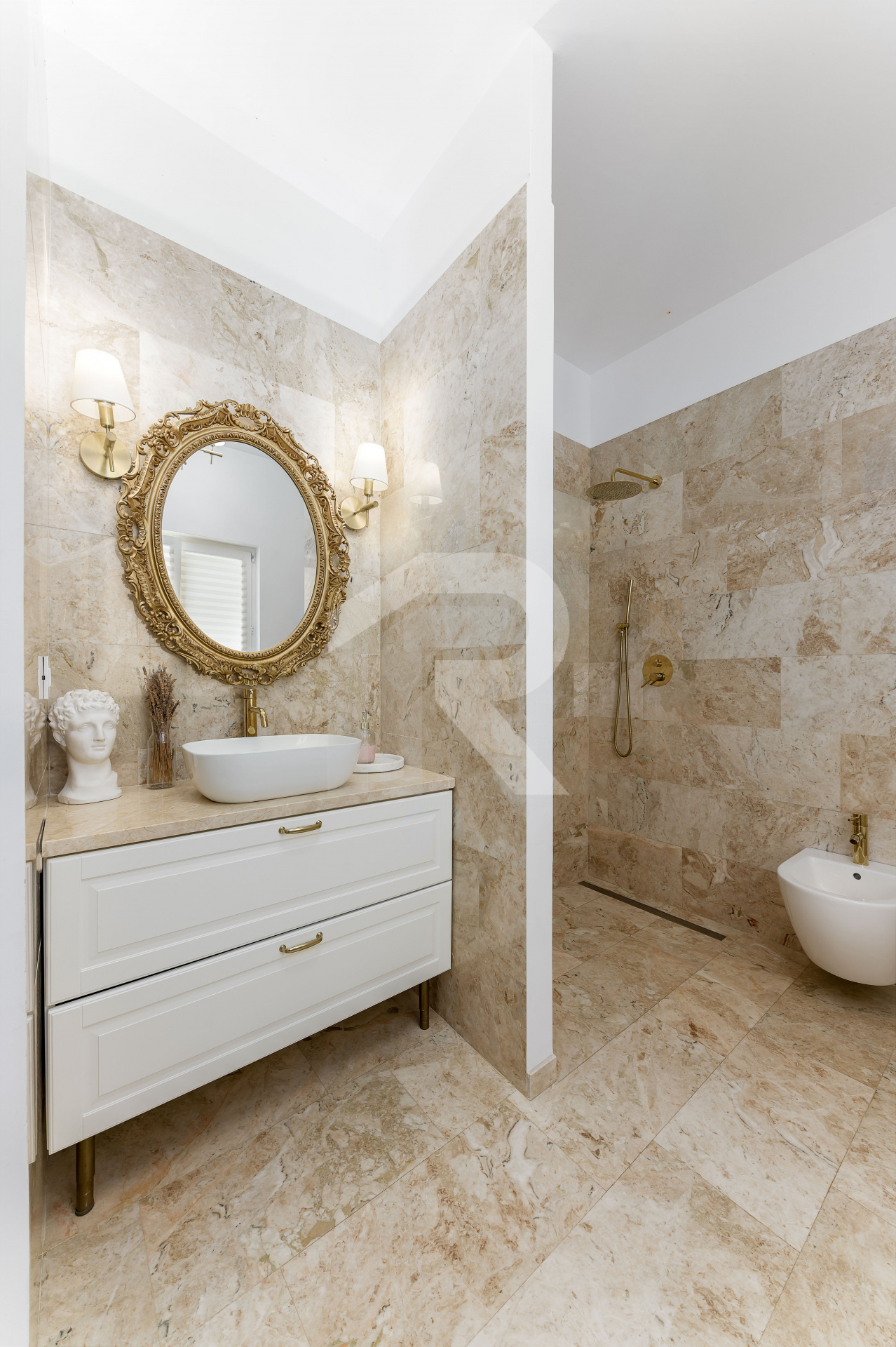 Baie generoasă (cu cabină de duș) și un hol de sosire prevăzut cu un dressing larg.