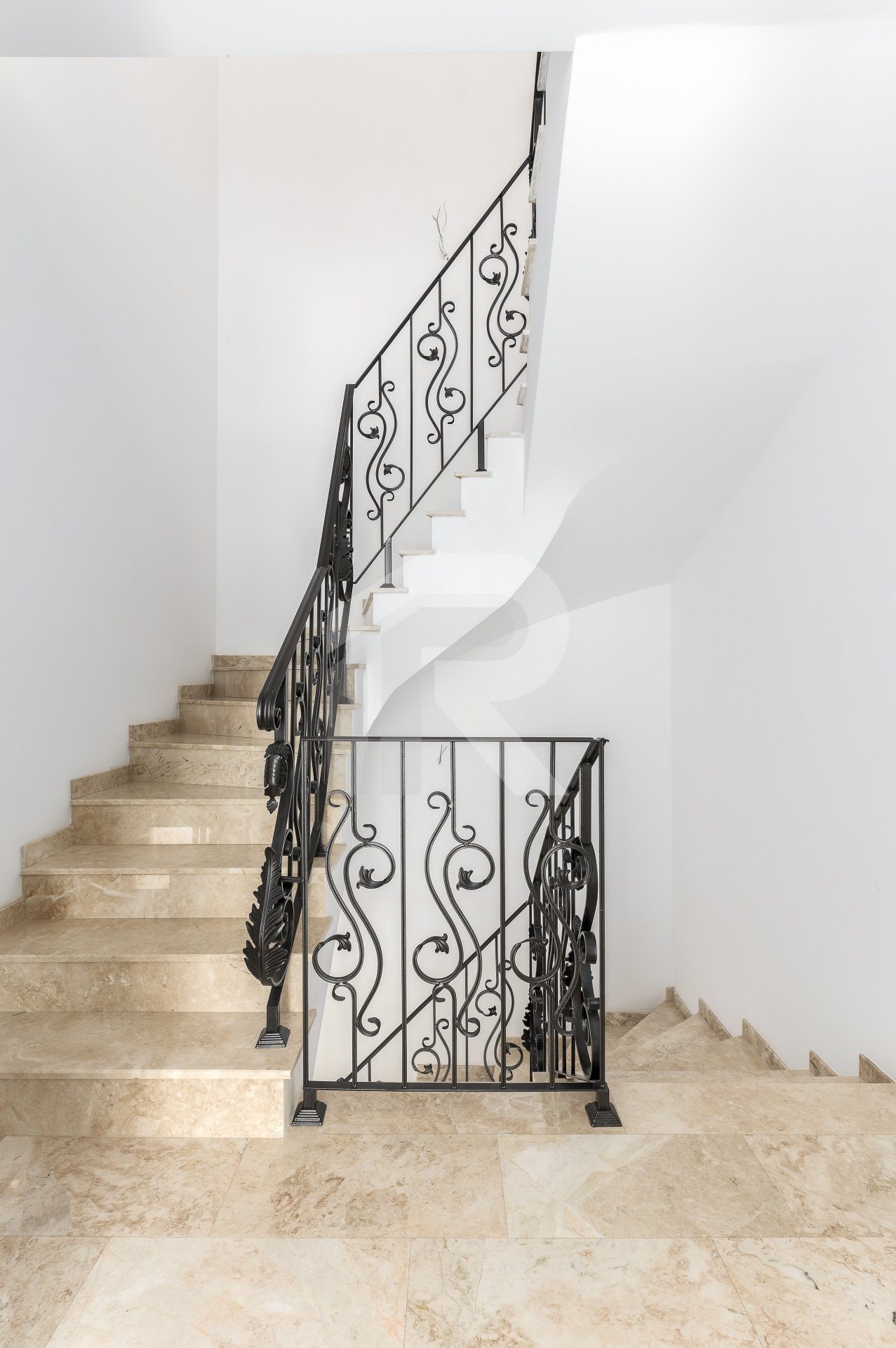 Scara interioară frumos conturată, cu mână curentă din fier forjat – un detaliu rafinat redefinind eleganța clasică.