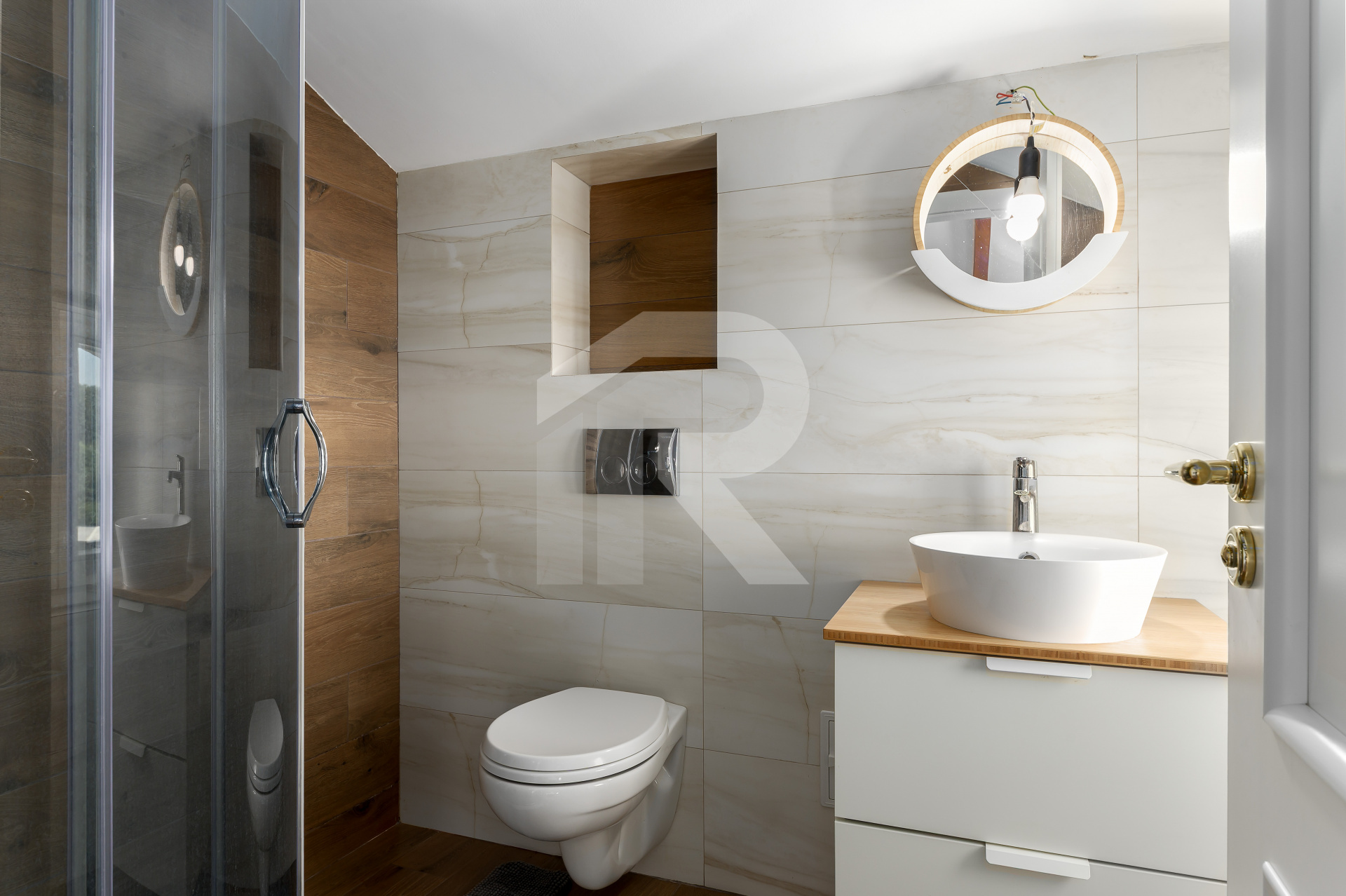 Baie cu cabină de duș și spații de depozitare inteligente – perfect gândită atât pentru familie cât și pentru oaspeți.